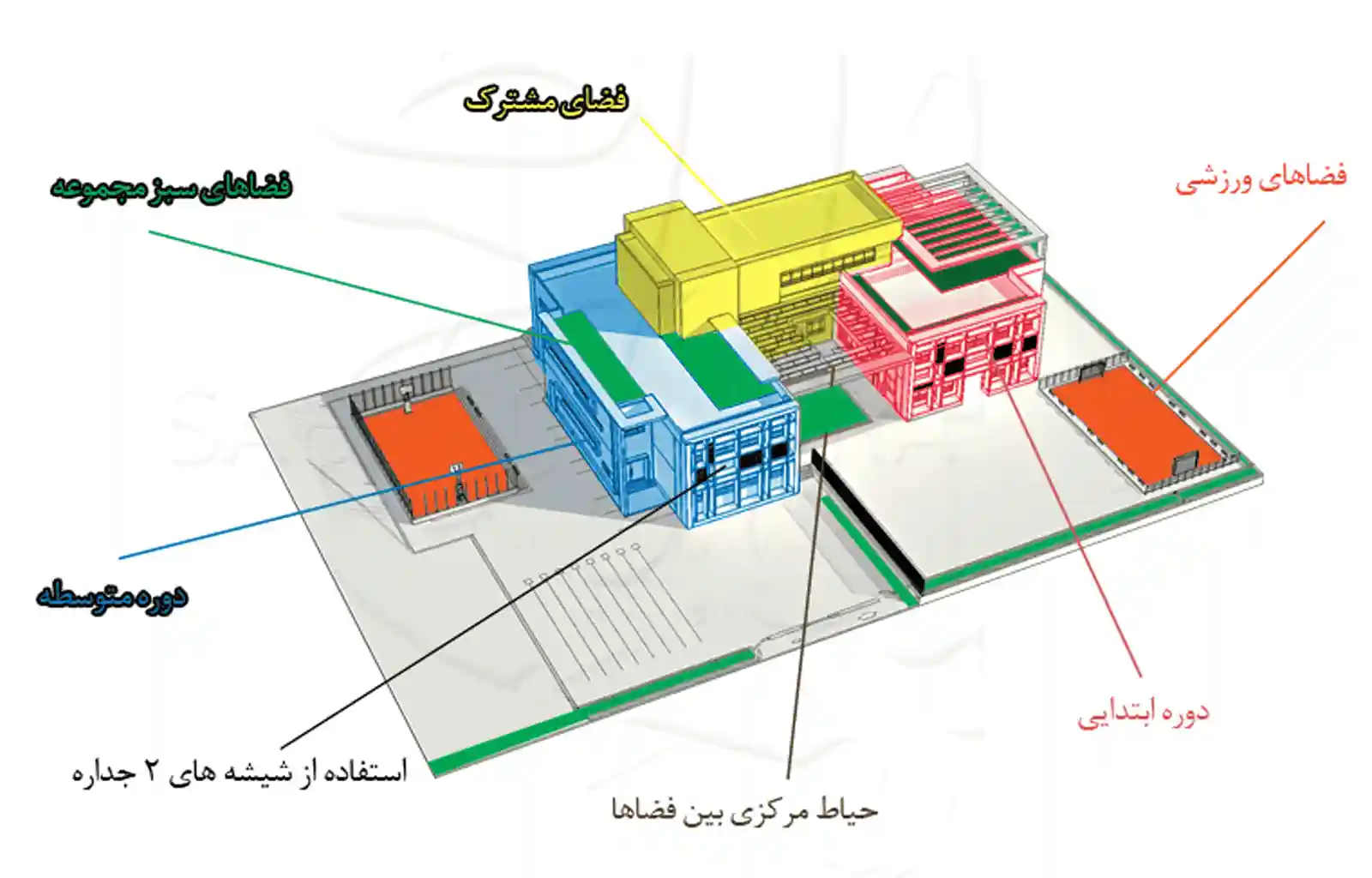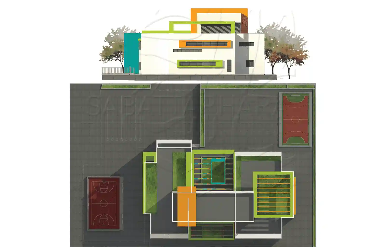 یکی از مهمترین سیستم های آموزشی کودکان استثنایی ، سیستم آموزشی مبتنی بر بازیها است . طراحی فضای آموزشی با این الگو و هندسه و ترکیب رنگ مهمترین ایده در ایجاد فضای شناخته شده و دارای ارتباط قوی با این کودکان می باشد . ترکیب الگوی جدول مانند و خانه به خانه بازی کودکانه با الگوی حیاط مرکزی ایرانی و استفاده از مشابهت ها جهت تعریف فضاهای نیمه بسته و نیمه باز و هدایت فضای سبز به داخل مجموعه با ایجاد حیاط مرکزی و پشت بام سبز با ترکیب رنگها یک الگوریتم و ترکیب شناخته شده برای کودکان می باشد .